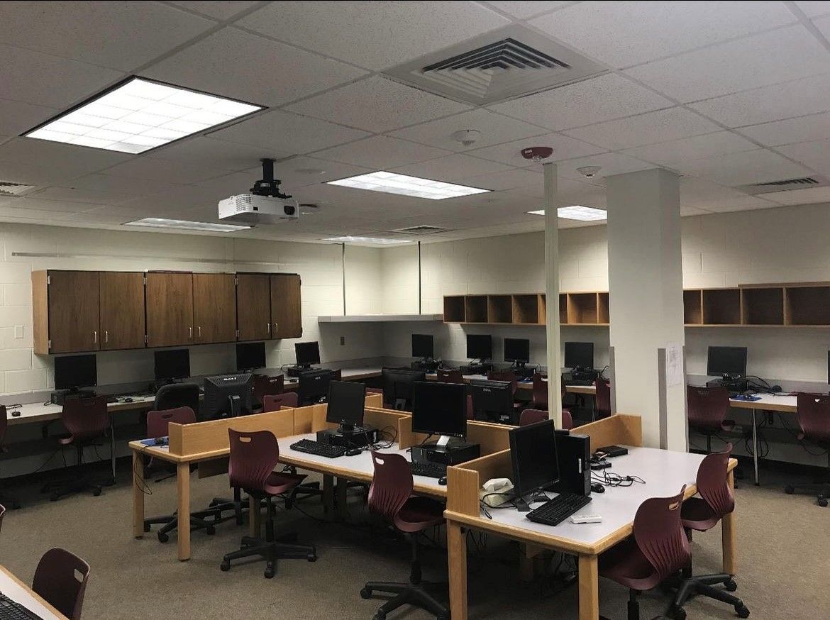 The Learning center features a Spacecraft room, Transport room, Mission Control room, Clean room Briefing rooms. The work consisted of complete demolition of the existing space, all new walls/openings, new HVAC, Plumbing & Electrical, open cell metal ceilings, Challenger Display graphics throughout, custom wood storage cubbies, solid surface countertops, resilient athletic flooring, Reception desk featuring illuminated panels, a sliding Airlock door and much more…all of which resembles what you would find in the Challenger Aircraft.